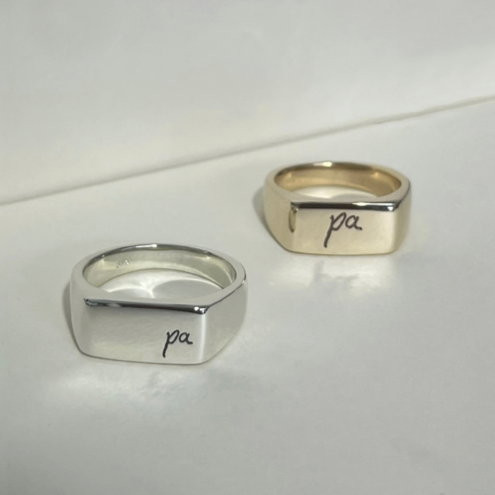 Sterling Silver Signet face is approx 7 x 13mm with rounded edges. The band width tapers down to 3mm wide at the back. Machine engraved at our Melbourne studio. Please use our Ring Size Chart here if you need assistance finding your ring size. This piece can be purchased as a blank signet or with one of the below engraving options: Standard LC Characters: Initials, dates, names or words in one of the three fonts pictured. Please specify your engraving (in either capitals or lower case) and font selection in the special requests when you add to your cart. Character height is 2mm unless it needs to be scaled down to fit your request. Your engraving will be centred unless specified otherwise. Single Initial | $15 Multiple initials, words or dates | $30 Custom Artwork: Artwork to be provided by the customer - simple drawings or the handwriting of a loved one. Please respond to your order confirmation with the artwork you would like engraved onto your piece. Your engraving will be centred and in a size chosen by us unless specified otherwise. Ink Impressions: Artwork to be provided by the customer - ink fingerprints or pet prints. The finished piece will depend on the quality of the ink impressions you provide. Your engraving will be as clear and defined as your ink print is. We will do our best to enhance the lines where possible without changing the print itself. In instances where we deem it necessary, we will use only a partial section of the print. If you are not sure about the quality of your ink impressions you are welcome to email a close up, high resolution photo of them to laser@lindencookdesign.com before placing the order and we can advise whether they will be suitable. Please use black ink for your impressions. Standard ink kits can generally be found in post shops and stationary stores. Press your finger lightly onto paper that is against a hard, flat surface and try not to roll or smudge the ink. Please do this several times, so the print gets lighter every time.