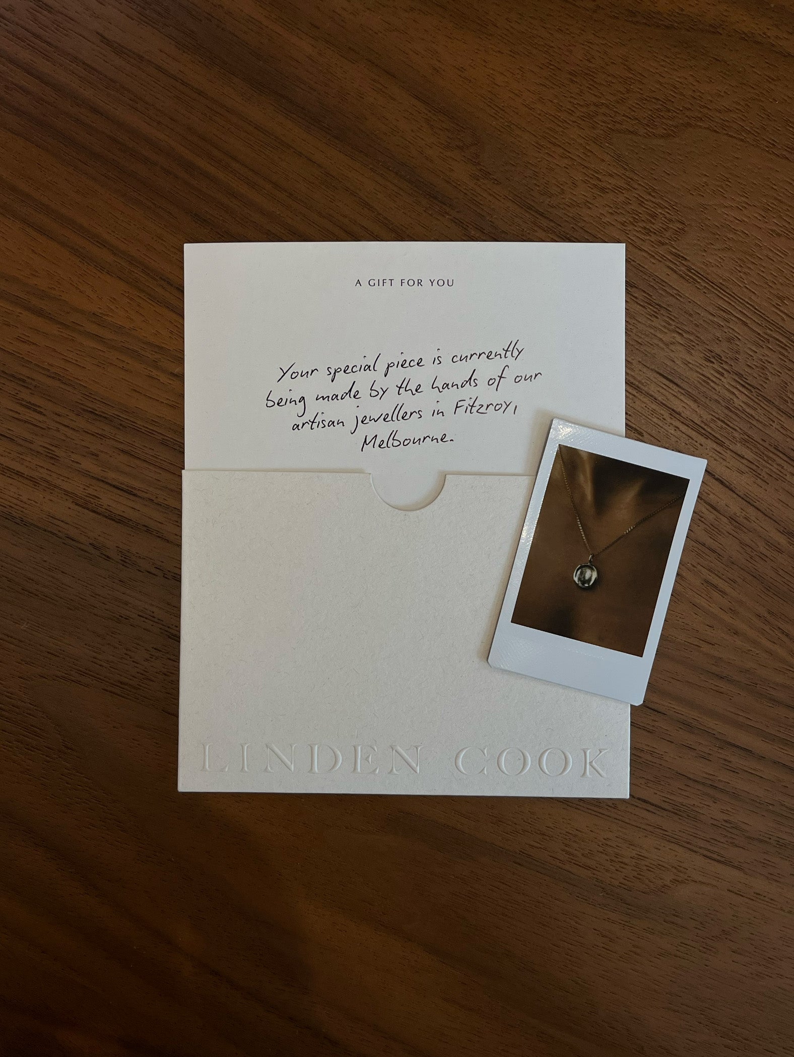 Includes a note and polaroid of their piece in our signature pocket, wrapped beautifully with a ribbon. The cost of this piece covers the materials and express shipping, to ensure that even at the last minute your gift arrives beautifully wrapped and on time.